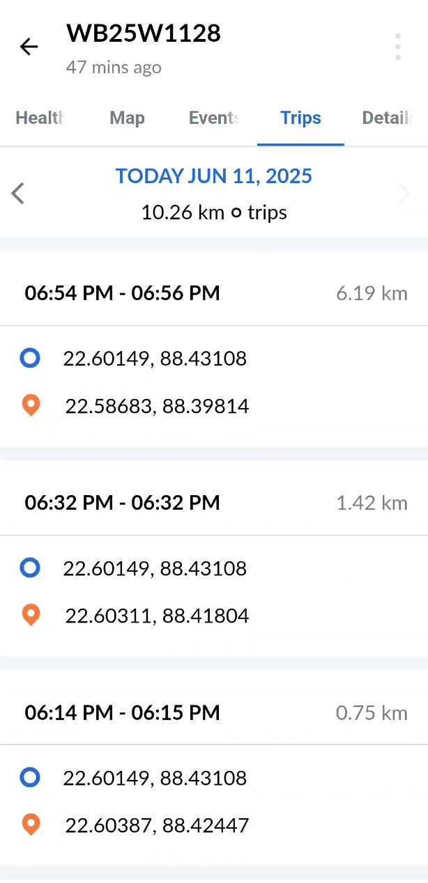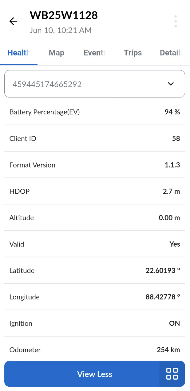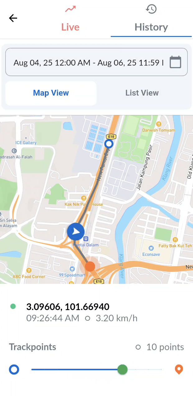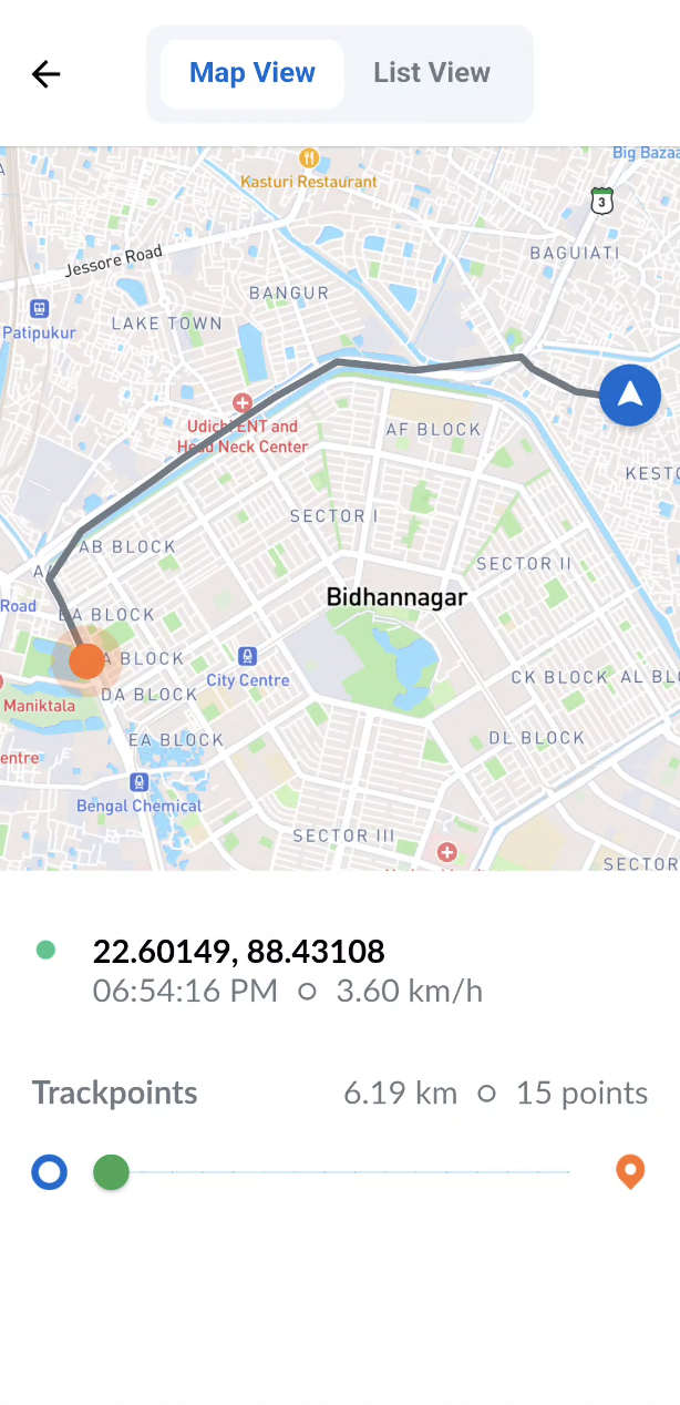- Map View - Displays the route of the selected trip on a map. Users can interact with the route using a slider at the bottom to seek through the trackpoints recorded during the trip. The following details are shown for the selected trackpoint: