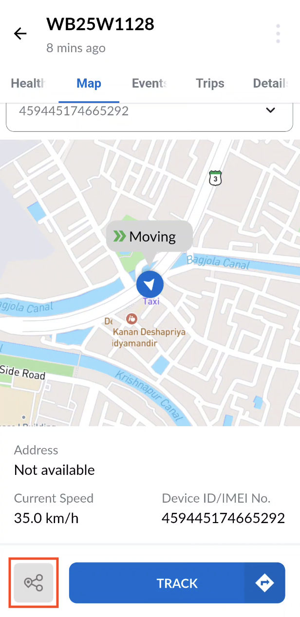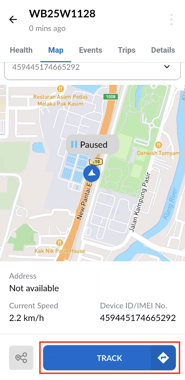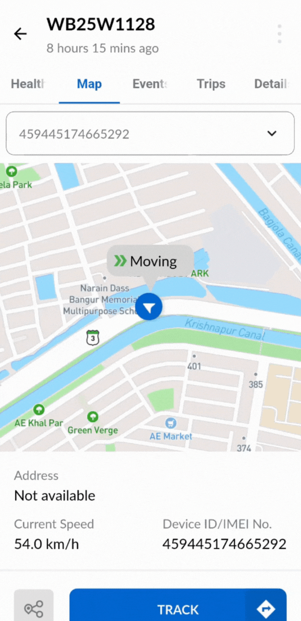 The Live and History Tracking feature in the mobile app enables users to monitor their vehicles in real time and review past movements. This helps ensure safety, optimize routes, and maintain a clear record of vehicle activity. To view the tracking information tap on the "Track" button in the Map Screen.