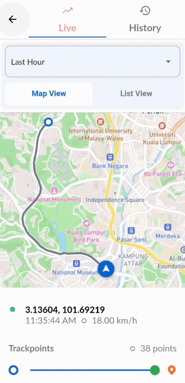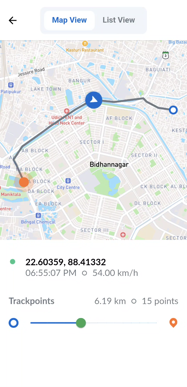 - Use the slider to seek a particular trackpoint and view its details like latitude, longitude (or Address if available), speed and time.