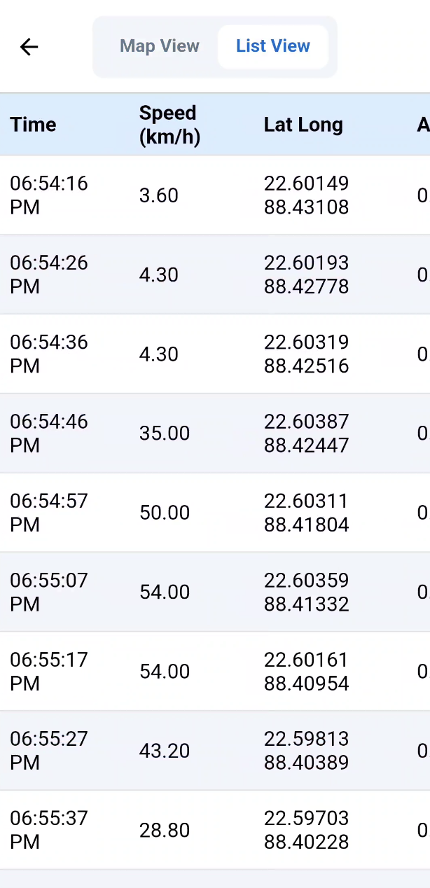 - List View - This view displays all recorded trackpoints of the trip in a structured, scrollable list format. Each entry includes: