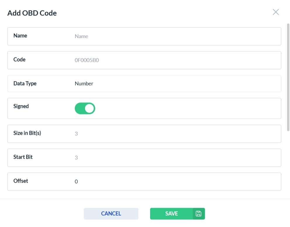 To add a new OBD code, click the Add New button. This will open the OBD code form. Complete all required fields, then click Save to store the new OBD code or Cancel to discard your changes.