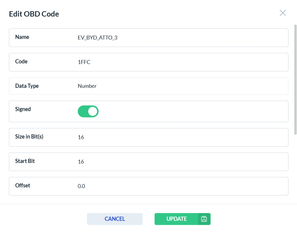 After clicking the edit icon in the Actions column, the OBD code form opens. Only the fields that are enabled can be edited—disabled fields are read-only. Click Update to save your changes, or Cancel to discard them.