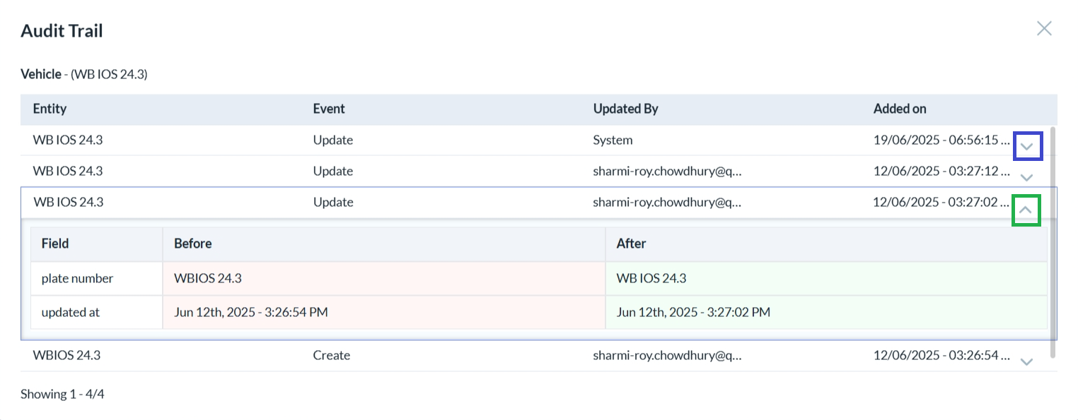 After clicking the audit trail icon in the Actions column, the audit trail opens. Click on the uncollapse icon to see the detailed changes (highlighted in a blue box). To collapse, click on the collapse icon (highlighted in a green box).