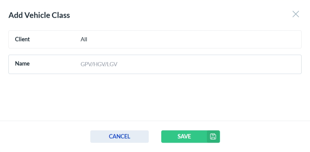 To add a new vehicle class, click the Add New button. This will open the vehicle class form. Complete all required fields, then click Save to store the new class or Cancel to discard your changes.