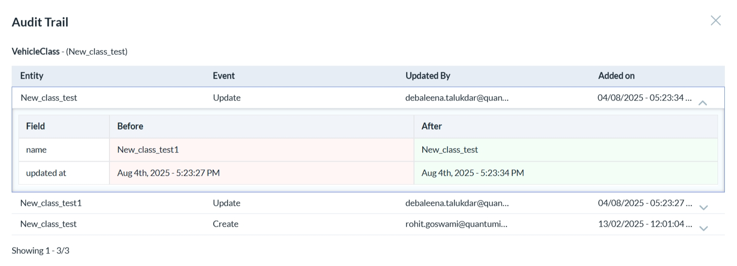 • To view the audit details of a vehicle class click on the third icon.