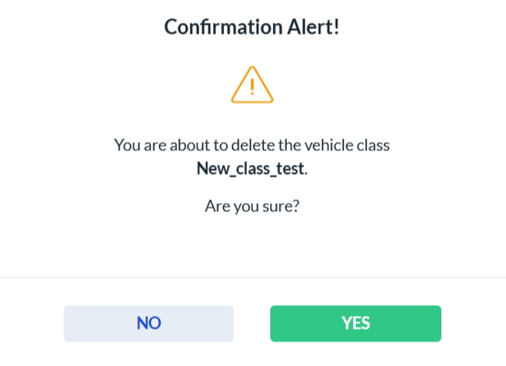 To delete a vehicle class, click the Delete icon in the Actions column. A confirmation dialog will appear. Click Yes to permanently delete the selected class, or No to cancel the action.