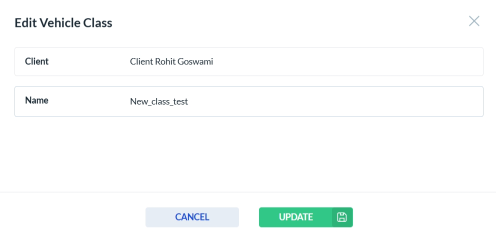 After clicking the edit icon in the Actions column, the vehicle class edit form opens. Only the fields that are enabled can be edited—disabled fields are read-only. Click Update to save your changes, or Cancel to discard them.