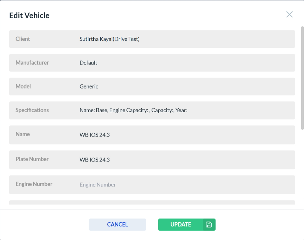 After clicking the edit icon in the Actions column, the vehicle form opens. Only the fields that are enabled can be edited—disabled fields are read-only. Click Update to save your changes, or Cancel to discard them.