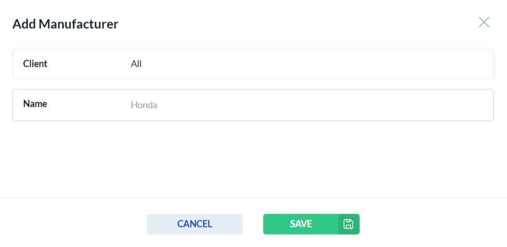 To add a new vehicle manufacturer, click the Add New button. This will open the vehicle manufacturer form. Complete all required fields, then click Save to store the new manufacturer or Cancel to discard your changes.