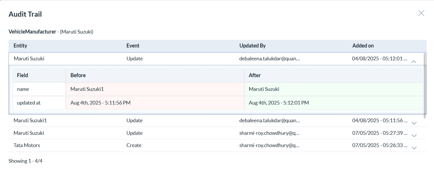 • To view the audit details of a vehicle manufacturer click on the third icon.
