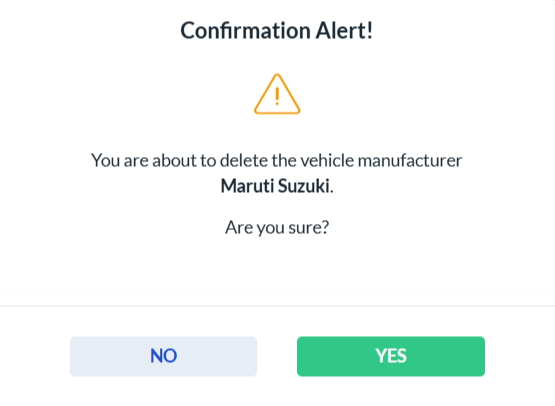 To delete a vehicle manufacturer, click the Delete icon in the Actions column. A confirmation dialog will appear. Click Yes to permanently delete the selected manufacturer, or No to cancel the action.