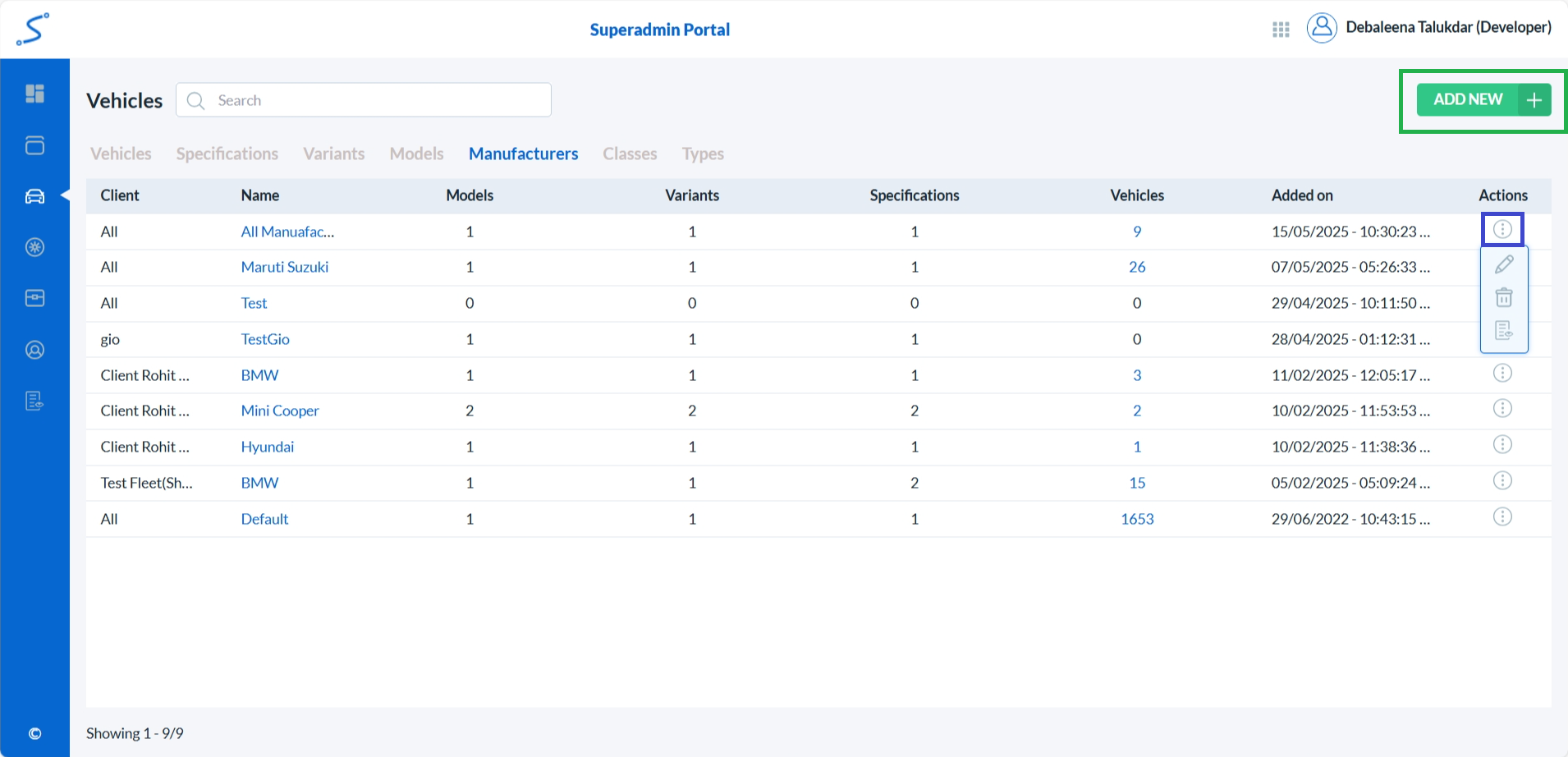 • To add a new vehicle manufacturer, click on the Add New button. (highlighted with a green box)