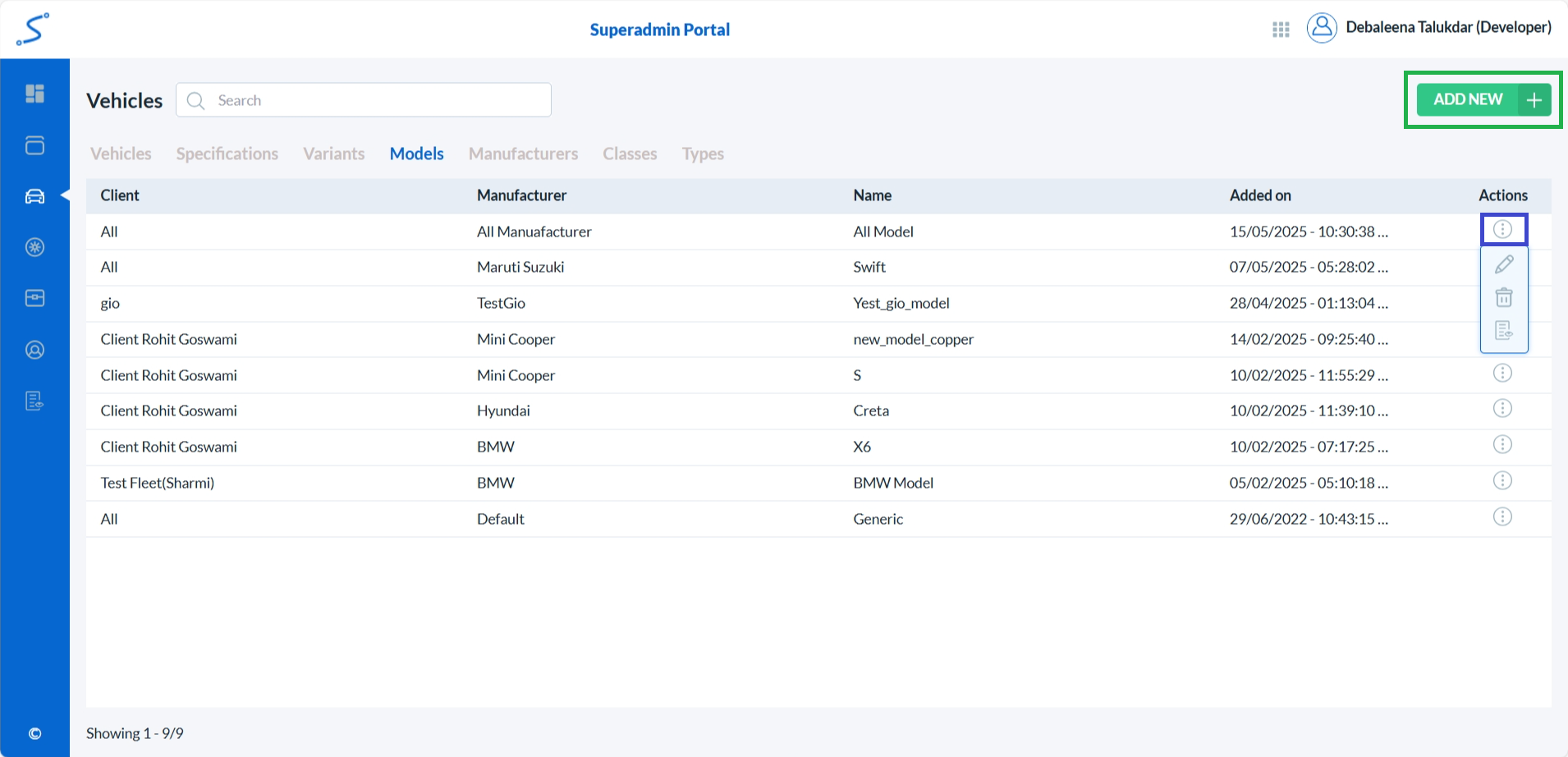 • To add a new vehicle model, click on the Add New button. (highlighted with a green box)