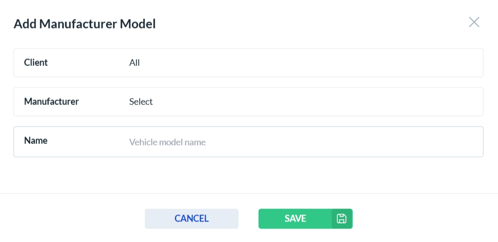 To add a new vehicle model, click the Add New button. This will open the vehicle model form. Complete all required fields, then click Save to store the new model or Cancel to discard your changes.