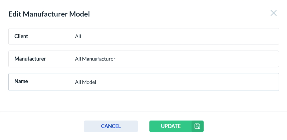 After clicking the edit icon in the Actions column, the vehicle model edit form opens. Only the fields that are enabled can be edited—disabled fields are read-only. Click Update to save your changes, or Cancel to discard them.