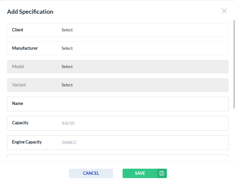 To add a new vehicle specification, click the Add New button. This will open the vehicle specification form. Complete all required fields, then click Save to store the new specification or Cancel to discard your changes.