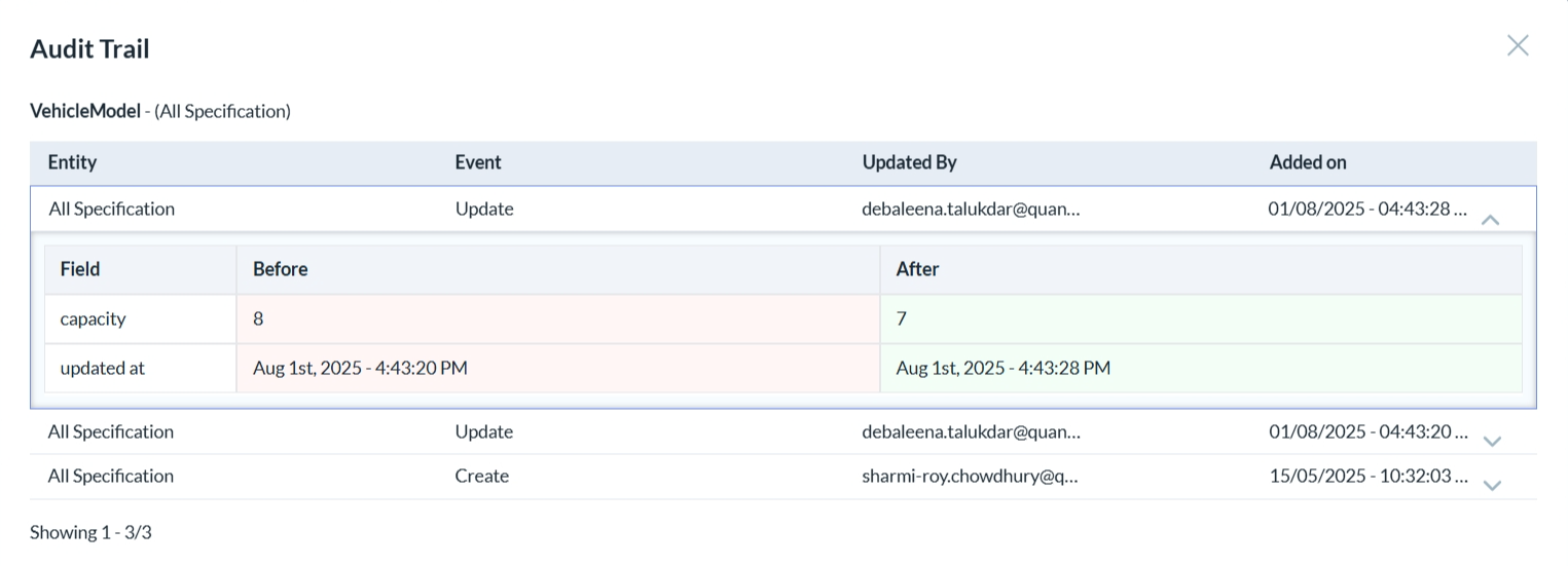 • To view the audit details of a vehicle model click on the third icon.