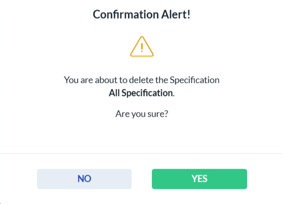 To delete a vehicle specification, click the Delete icon in the Actions column. A confirmation dialog will appear. Click Yes to permanently delete the selected specification, or No to cancel the action.