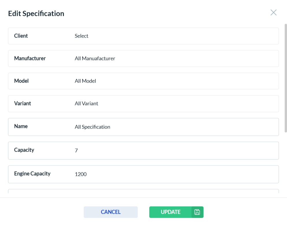 After clicking the edit icon in the Actions column, the vehicle specification edit form opens. Only the fields that are enabled can be edited—disabled fields are read-only. Click Update to save your changes, or Cancel to discard them.