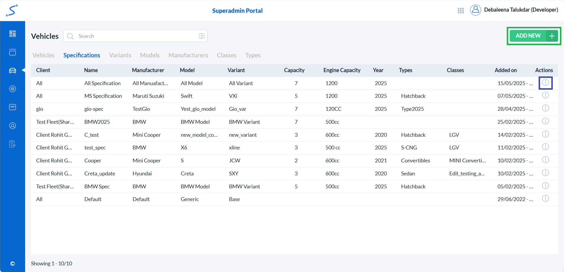 • To add a new vehicle specification, click on the Add New button. (highlighted with a green box)