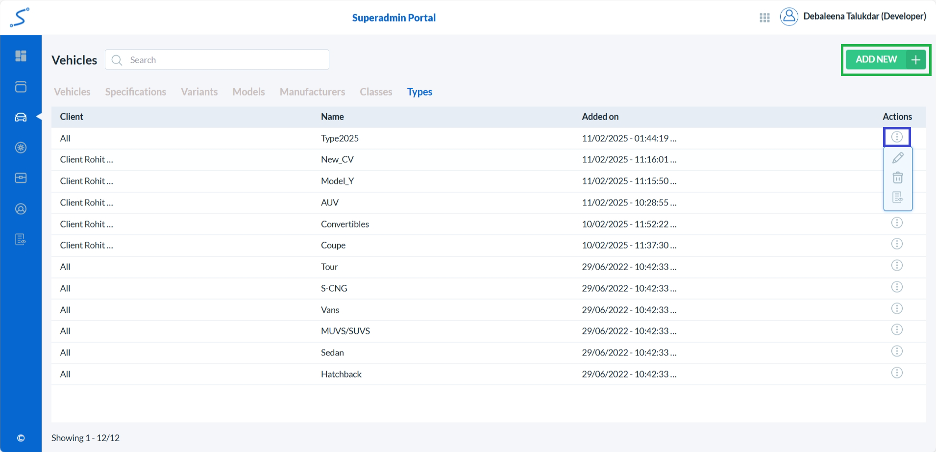• To add a new vehicle type, click on the Add New button. (highlighted with a green box)