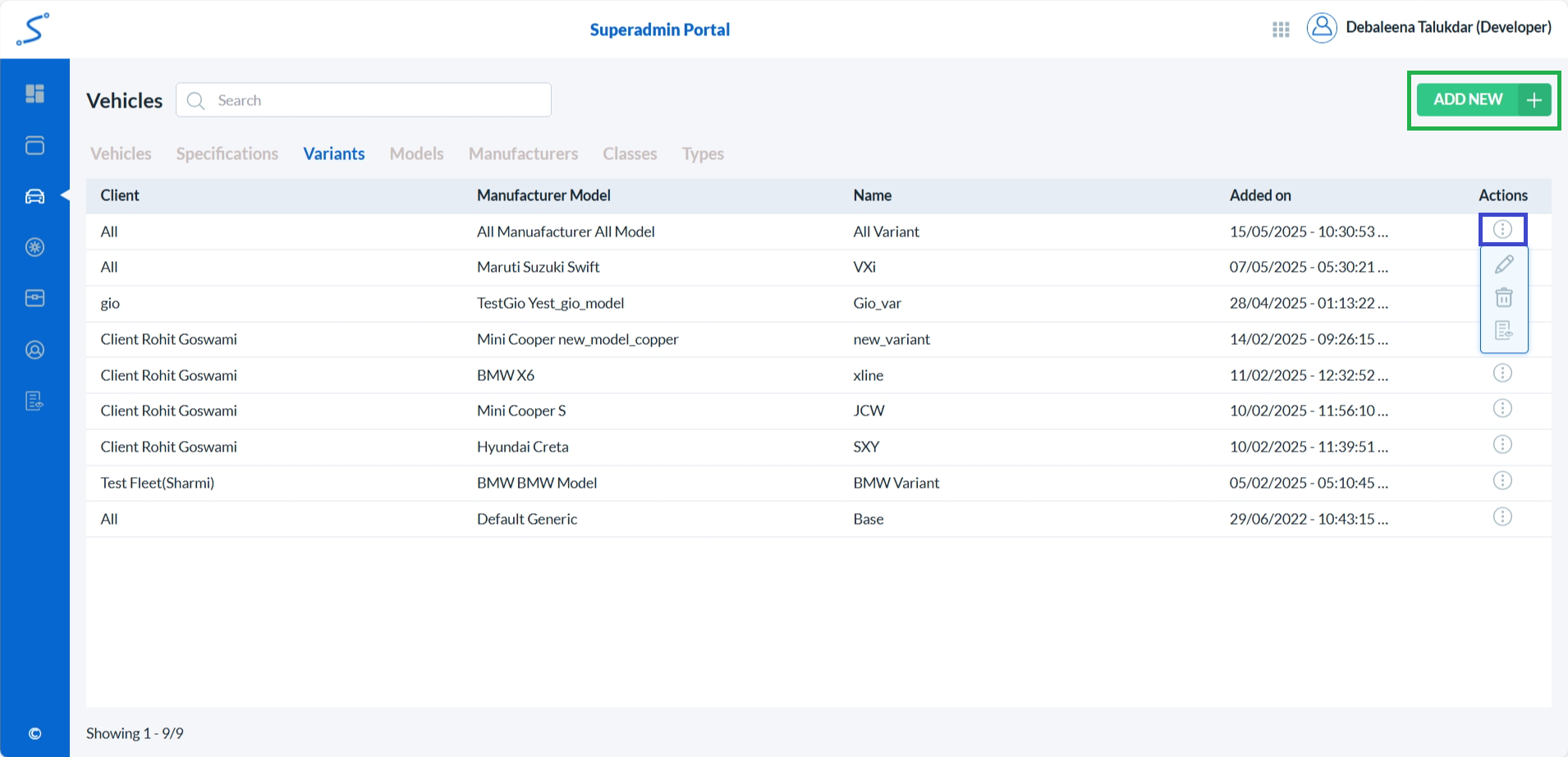 • To add a new vehicle variant, click on the Add New button. (highlighted with a green box)