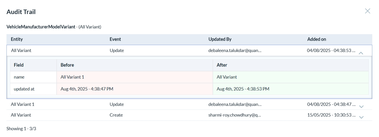 • To view the audit details of a vehicle variant click on the third icon.