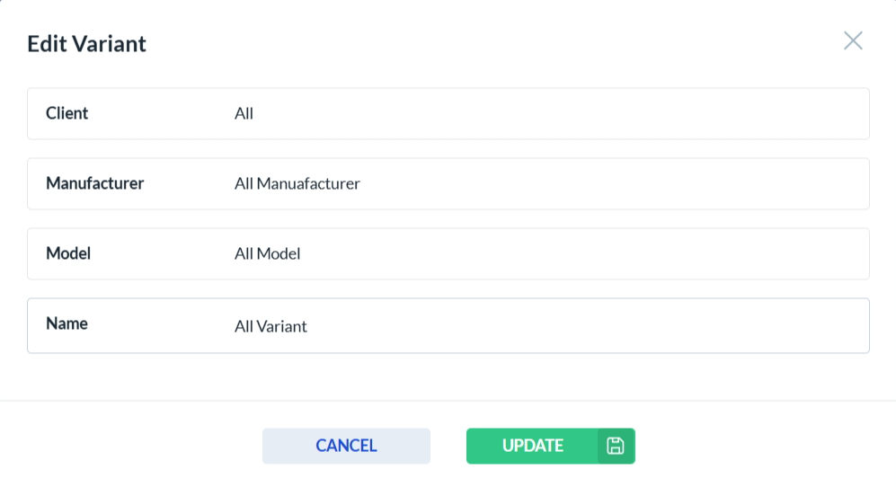 • Easily locate a vehicle variant using the search functionality by entering the Vehicle Variant Name and Client Name.
